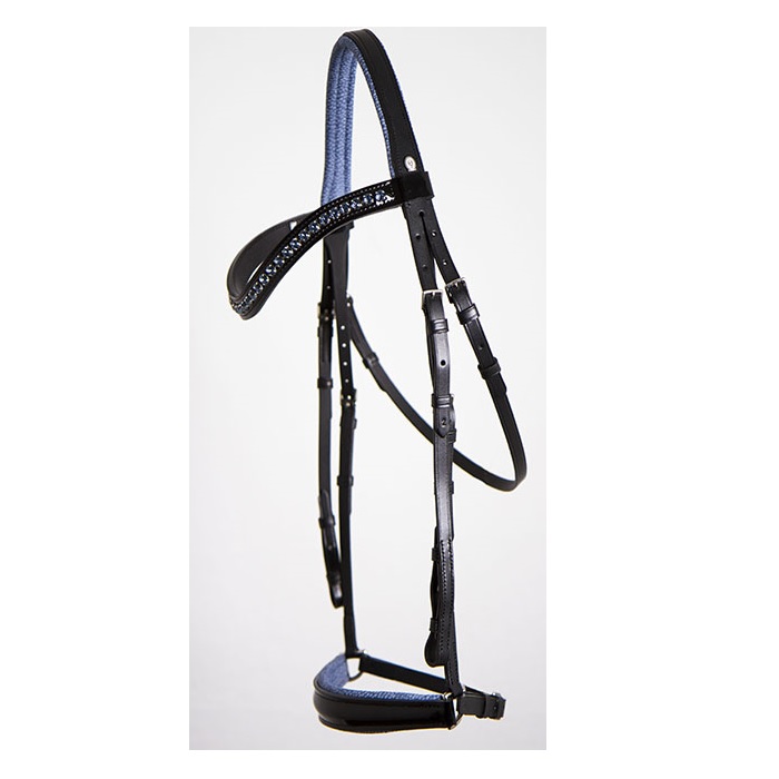 En stockBride Venedig XS avec muserolle retombée en cuir verni noir et rembourrage en bleu Nubuk.
